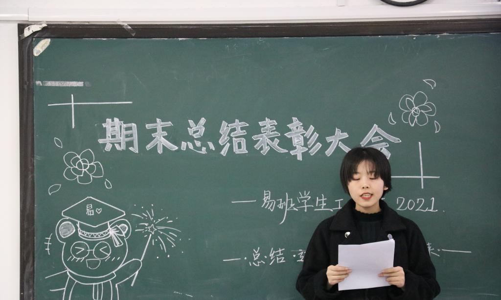 易班学生工作站站长杨意慧首先对易班2021年的工作进行总结,她从部门的日常管理、系列培训、举办线上、线下活动以及协助学生工作处进行迎新、辅导员素质能力大赛、日常工作等方面进行了总结,强调部门始终坚持以学生为本,根据节日、重大事件等重要时间节点开展喜闻乐见的思政教育活动,做到了“天天有声音、周周有记录,月月有活动”。值得一提的是,易班学生工作站通过开展见面会、包饺子、参观星箭玻璃、观看爱国主义电影《长津湖》等一系列团建活动,极大增强了部门的凝聚力。在部门年度表彰环节,指导教师给一二三等奖的同学颁发了奖品并合影留念。刘佳进行总结发言,她从团结、学习和完成蜕变三个方面对易班一年来的工作表示肯定,强调凝聚力是易班继续向前的不竭动力,持续开展部门专业技能的学习是易班提升的关键,每个人在易班的综合素质提高是易班发展壮大的前提,希望同学们在学好自己专业知识的前提下,为易班群策群力,共同建设一个更加美好的易班,希望大家全力“易”赴,一起成长。