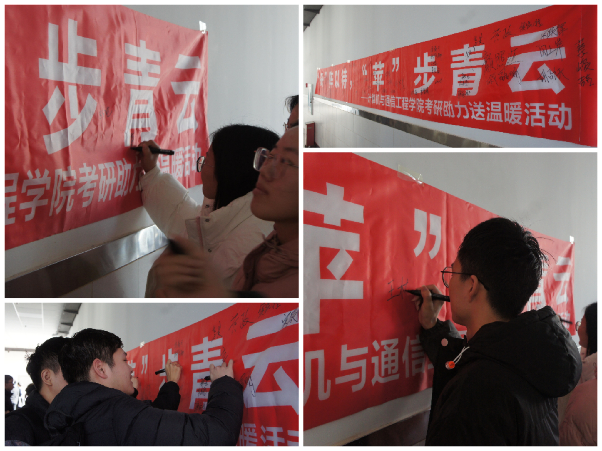 活动前期,学院精心准备了装有考试文具和贴心寄语的“福袋”以及象征‘苹’心静气、‘苹’步青霄的苹果。活动现场,宋昕向考研学子表达了鼓励,暖心的话语寄托着学院老师的殷切祝福,激励同学们不畏艰难,奋勇向前,为考研之路注入强大动力。辅导员樊灵伟就考研当天的具体时间安排、考场相关注意事项以及考前生活作息方面分别进行了细致地讲解。师生围绕考研最后阶段各方面的事宜进行了热烈讨论。最后,嘉宾老师在主题条幅上留下诚挚的祝愿,即将奔赴考场的学子们领取了“福袋”及祝福苹果并在条幅上签名留念。