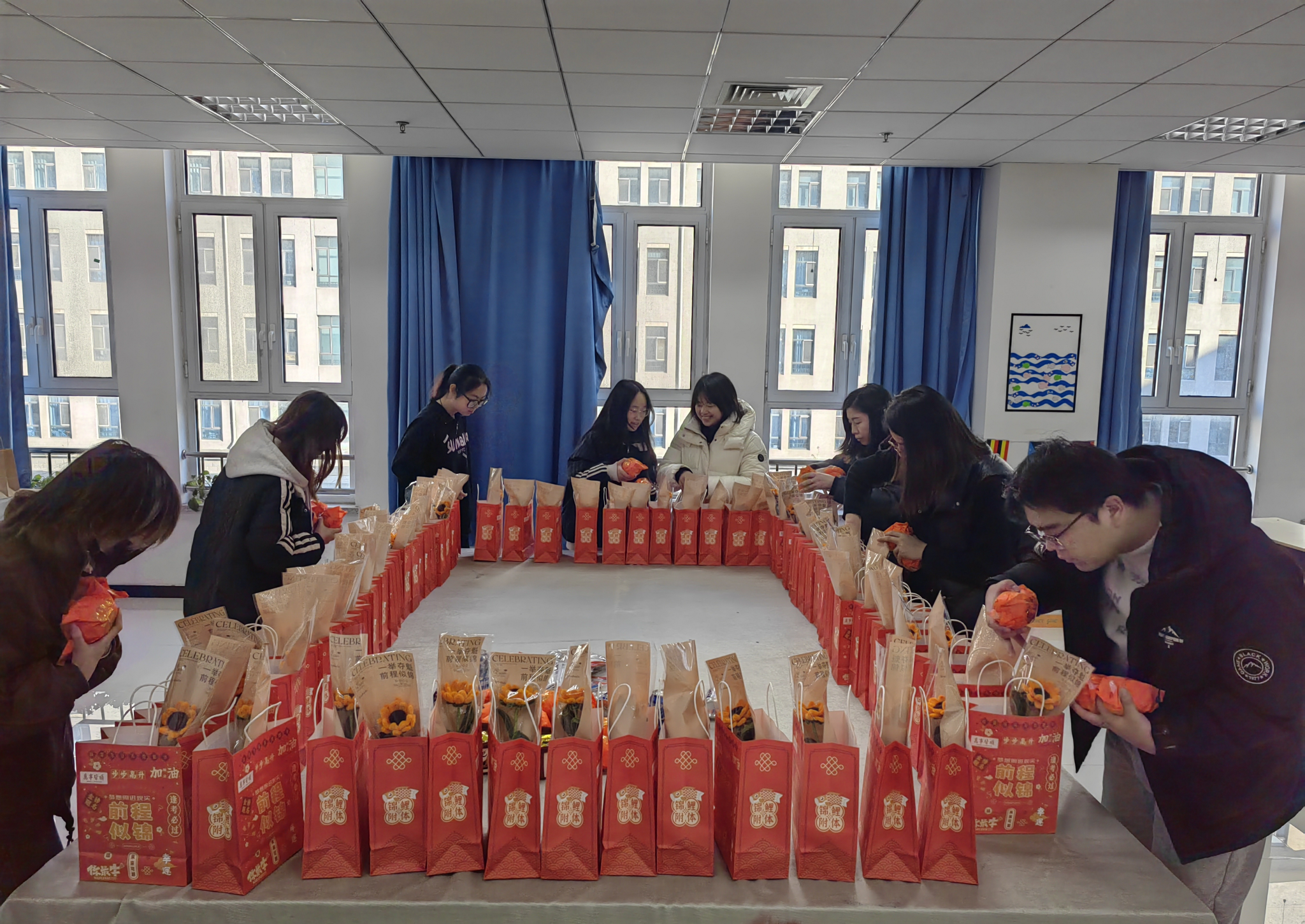 活动现场还播放了特别录制的祝福视频,学长学姐、学弟学妹们通过镜头传递着对考研学子的支持与期待。随后,学院的老师们亲自为大家送上了精心准备的考研暖心大礼包。礼包中不仅有实用的文具用品,还有寓意深长的手工向日葵、"心想事成"的橙子、"旺旺"系列的零食以及学弟学妹们手写的祝福贺卡。每一件礼物都承载着学院师生对考研学子最美好的祝愿。