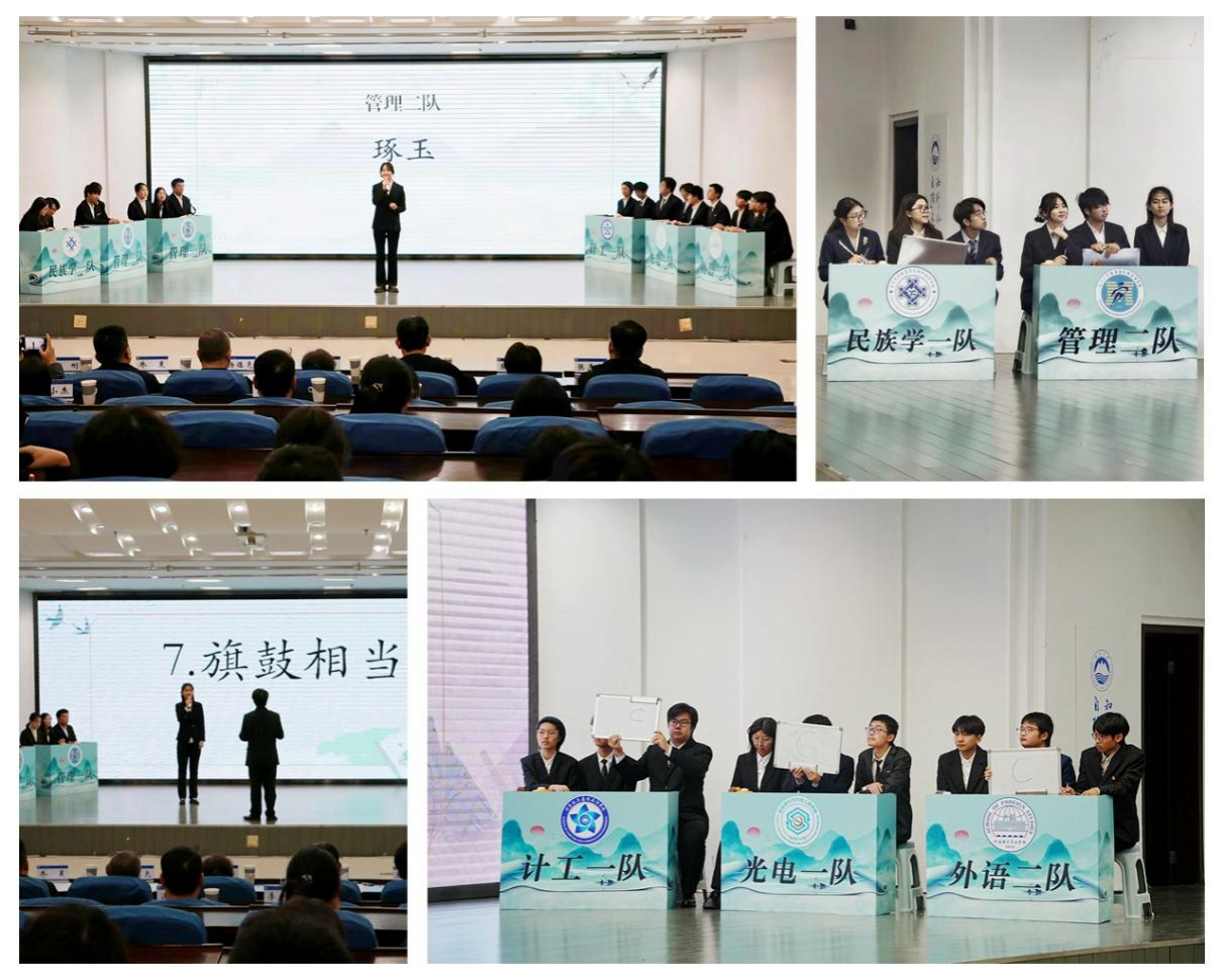 本次竞赛由我校党委宣传部主办,管理学院承办。初赛阶段吸引了来自各学院和研究生分院的20支队伍踊跃报名,经初试选拔,6支队伍脱颖而出晋级决赛。决赛设置助力题、必答题、抢答题、描述题、阐释题、评述题、飞花令、风险题8个环节,内容涵盖诗词成语、历史典故、习俗礼仪、文化艺术等多个方面,旨在传承和弘扬中华优秀传统文化,引导学生增强文化自觉、坚定文化自信。比赛现场气氛热烈,选手们或沉稳作答、引经据典,展现扎实功底;或反应敏捷、果断抢答,彰显团队协作与应变能力。阐释与评述时,他们思路清晰、旁征博引,表现出良好的思辨水平。飞花令环节中,他们才思泉涌、佳句层出,尽显深厚的文学积累与出色的临场风采。整场赛事节奏紧凑、文化内涵丰富,既展现了我校学生全面扎实的知识储备,也进一步激发了广大学子对中华优秀传统文化的学习兴趣。
