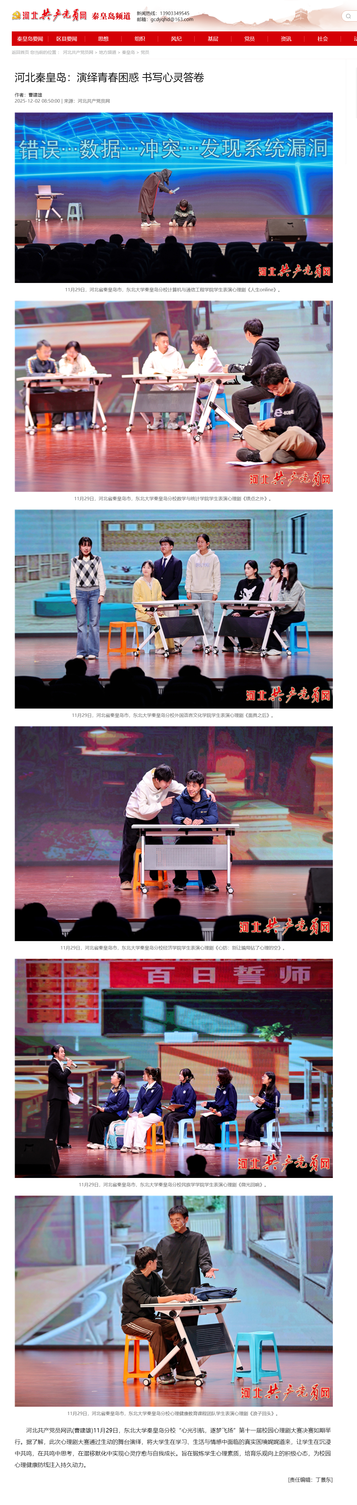 河北共产党员网讯(曹建雄)11月29日,东北大学秦皇岛分校“心光引航,逐梦飞扬”第十一届校园心理剧大赛决赛如期举行。据了解,此次心理剧大赛通过生动的舞台演绎,将大学生在学习、生活与情感中面临的真实困境娓娓道来,让学生在沉浸中共鸣,在共鸣中思考,在潜移默化中实现心灵疗愈与自我成长。旨在锻炼学生心理素质,培育乐观向上的积极心态,为校园心理健康防线注入持久动力。