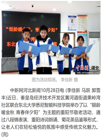 10月24日,东北大学悉尼智能科技学院联合秦皇岛开发区果岭湾社区,共同举办以“银龄暖金秋,青春伴夕阳”为主题的重阳节敬老活动,并受到中国新闻网报道。