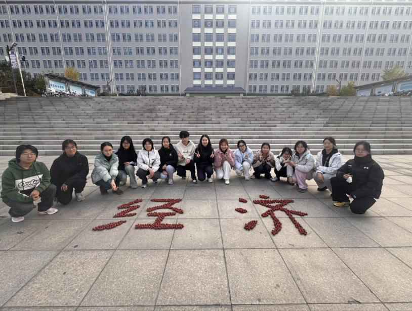 随着采收的山楂渐渐成堆,在指导老师的倡议下,志愿者们围坐于空地旁,认真挑选出颜色鲜亮、形态圆润的优质山楂,精心排列成“经济”二字。这一创意展示不仅点明了学院身份,也为劳动实践增添了仪式感与归属意义。
