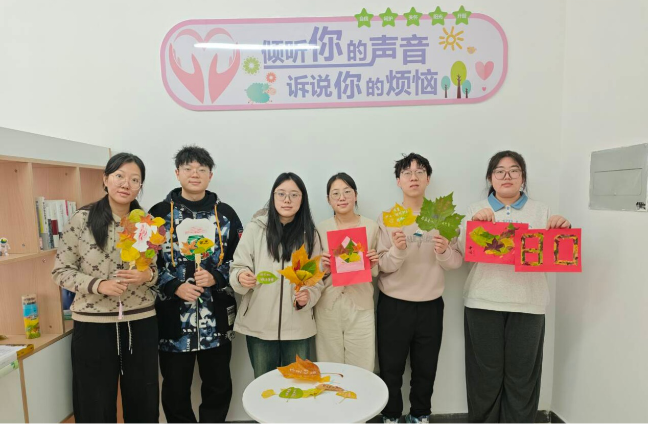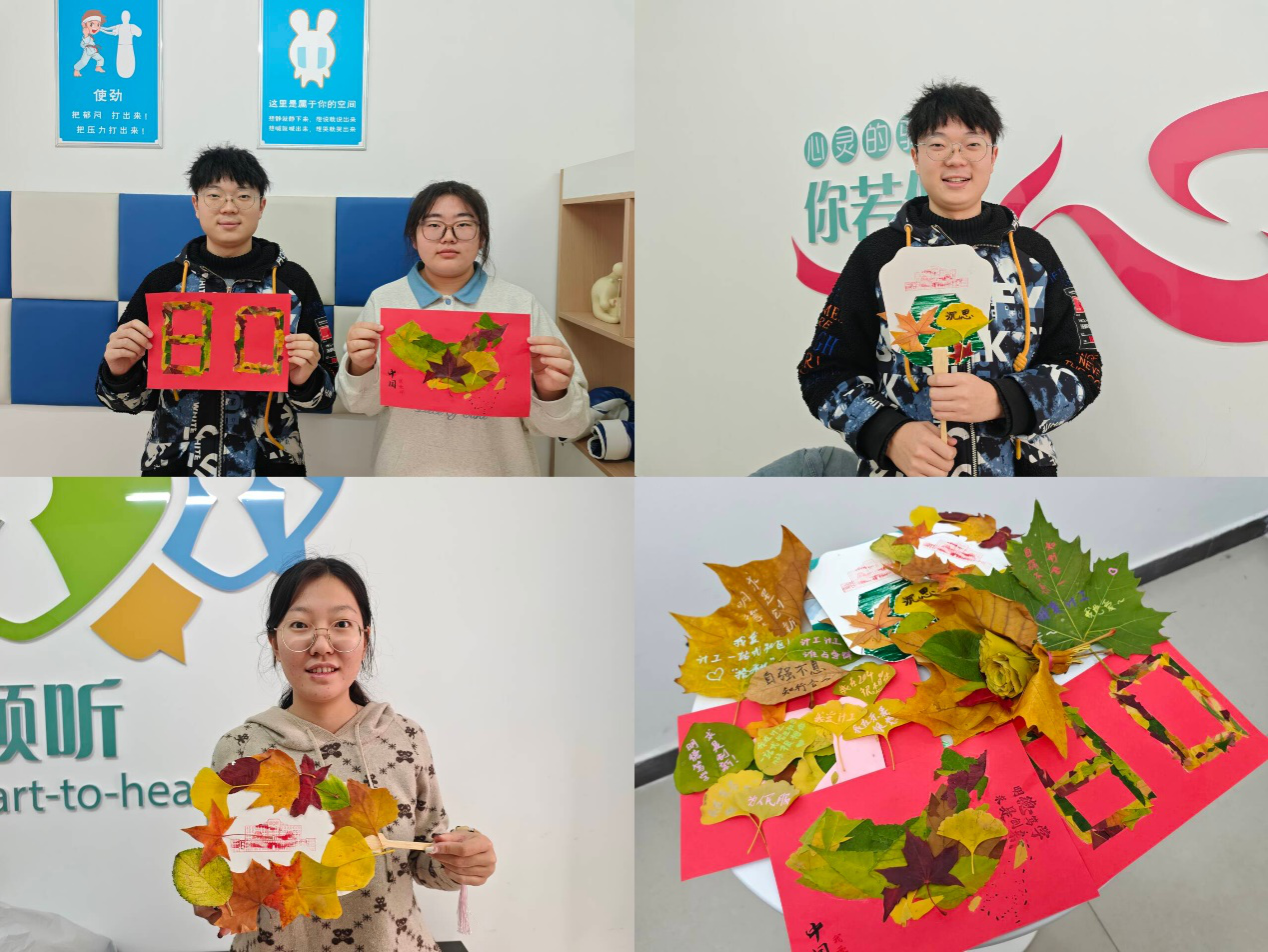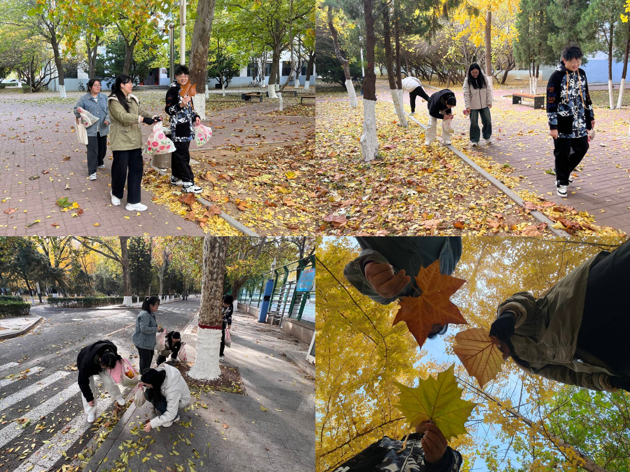 活动当天,学生们沿着校园秋景路线开展“拾秋”采风,细心收集银杏叶、枫叶等自然素材。金黄与火红交织的落叶不仅展现了深秋的诗意画卷,也成为承载创作灵感的独特媒介。采风结束后,同学们返回学院“一站式”学生社区,开启手工拼贴创作环节。