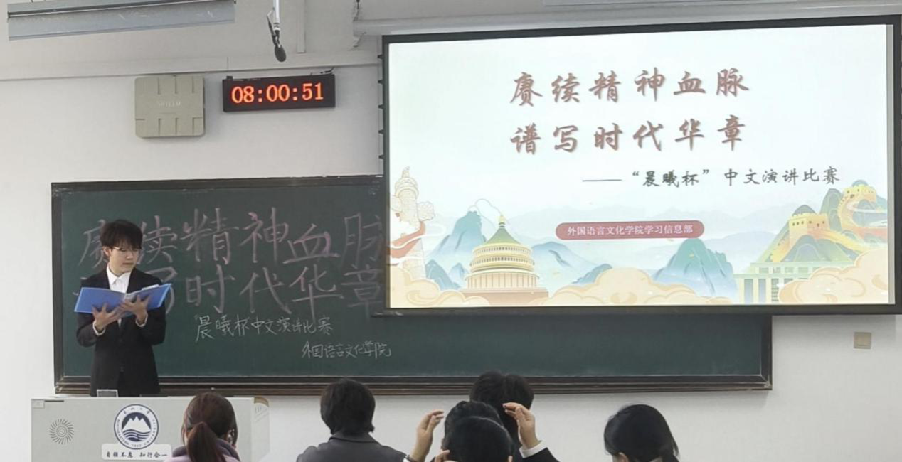 11月2日,外国语言文化学院于工学馆225室举办了以“赓续精神血脉 谱写时代华章”为主题的中文演讲比赛。赛事评委由外国语言文化学院日语专业教师谷端捷、辅导员王总老师及院学生会主席团成员陈清共同担任。