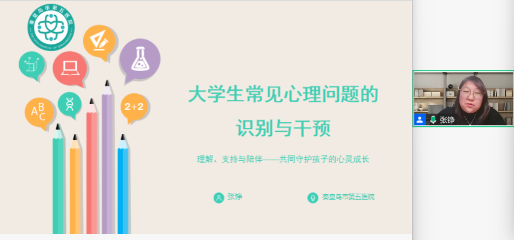 为加强家校医三方心理育人合力,提升家长精准识别与科学干预大学生常见心理问题的能力,11月22日,学生工作处心理健康教育中心举办了第十一期线上家长心理讲堂。本次讲堂以“大学生常见心理问题的识别与干预”为主题,邀请秦皇岛市第五医院医教科副主任张铮担任主讲,学生家长、辅导员共同参与。