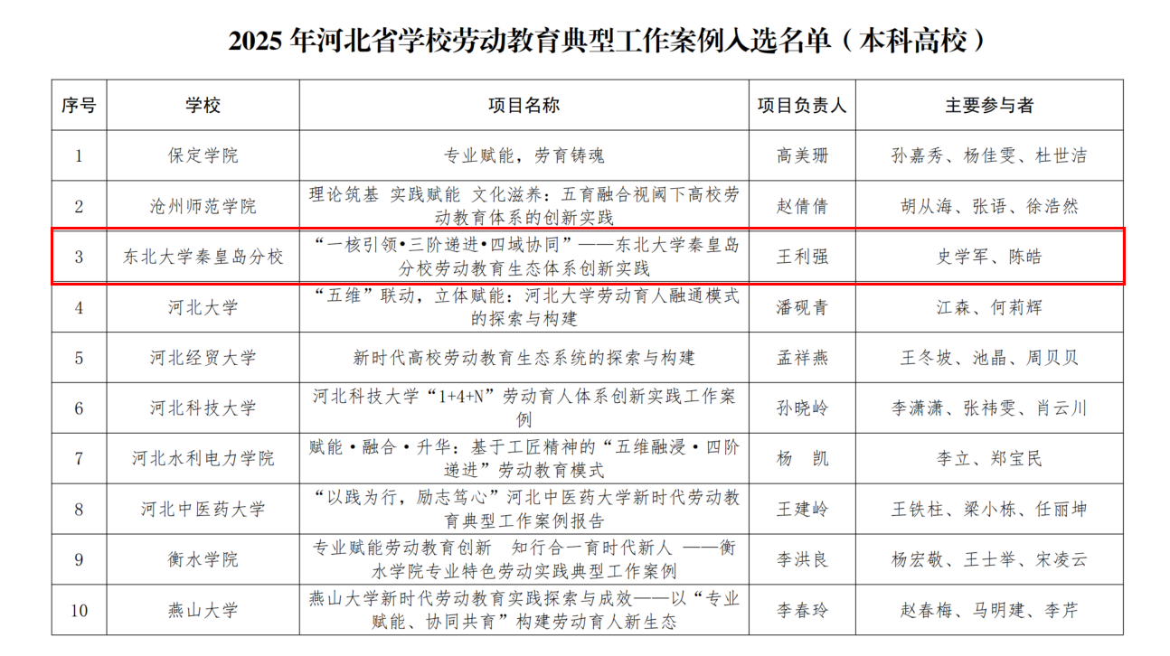 近日,河北省教育厅正式公布“2025年劳动教育典型工作案例和优秀教学设计”评选结果。我校学生工作处牵头申报的工作案例《“一核引领•三阶递进•四域协同”——东北大学秦皇岛分校劳动教育生态体系创新实践》成功入选典型案例。